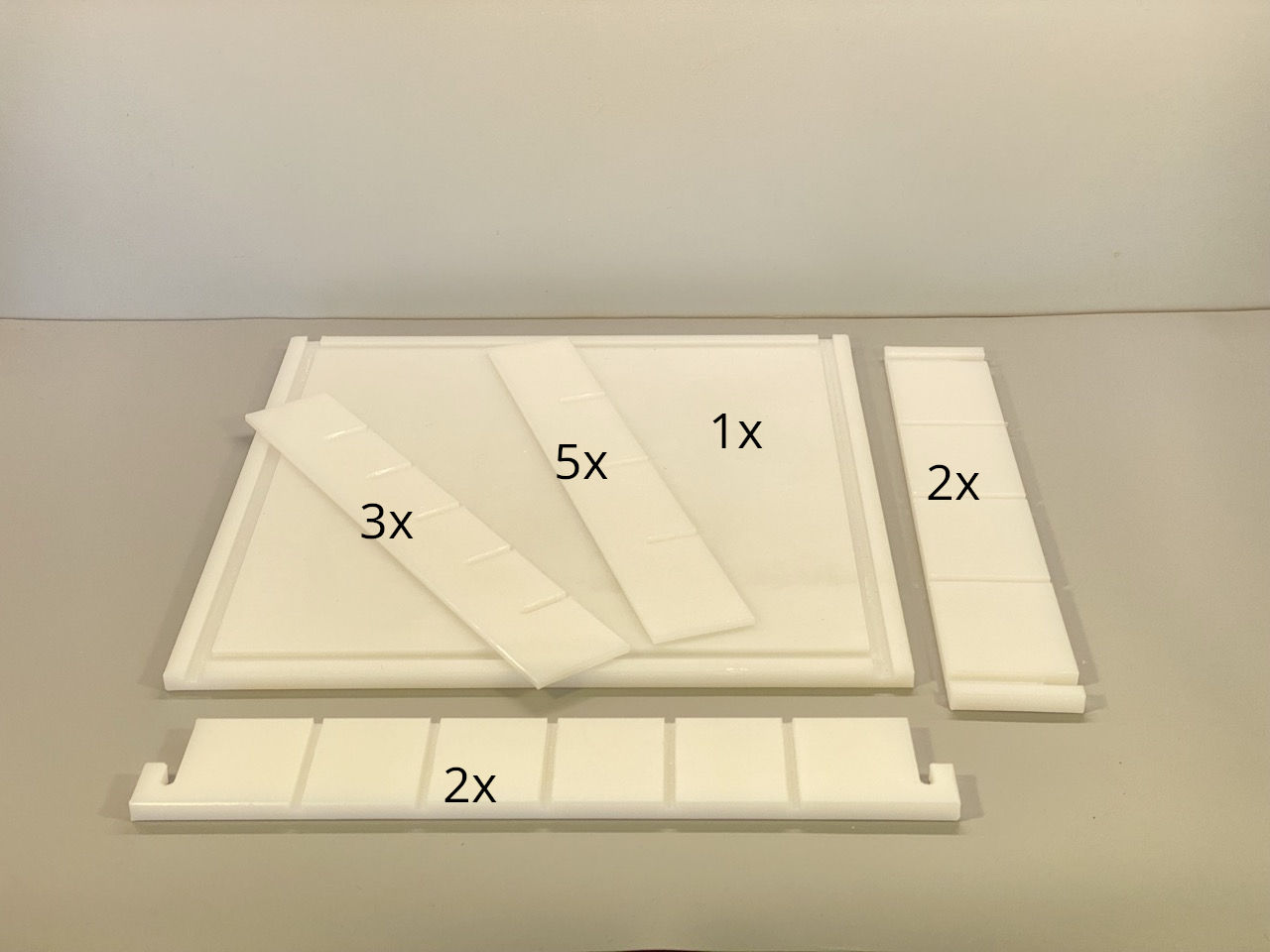 Zum 24er Divi gehören 8 Trennwände, die über Kreuz gesteckt die Einteilung der Form in 24 Stücke ergeben. Die Bodenplatte hat nur Nuten für die Außenwände, nicht für die Trennwände. Die Trennstege sind 5 mm dick. Die Außenwände und die Bodenplatte sind 10 mm dick.